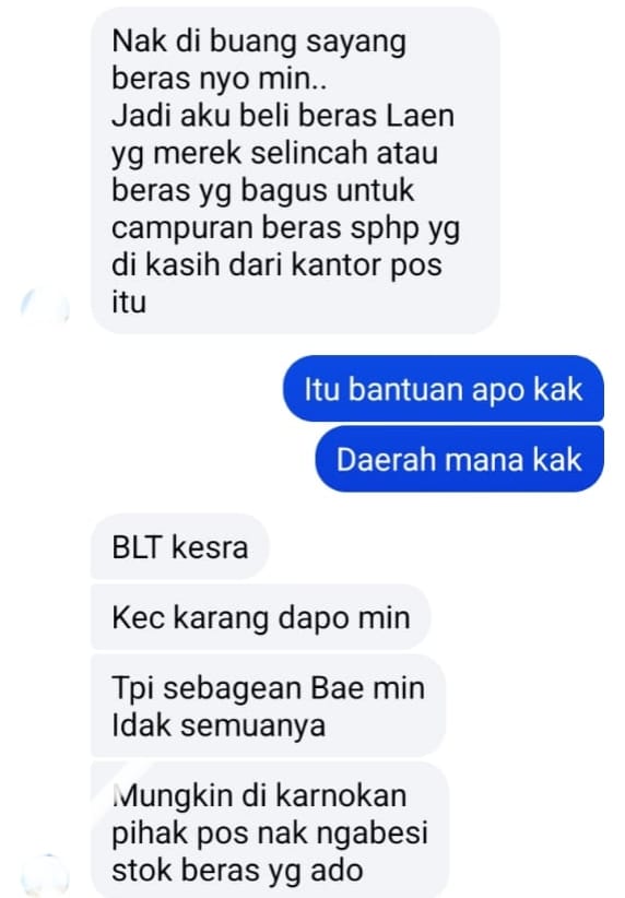Diduga Pegawai Pos Karang Dapo Tukar Uang BLT Kesra dengan Beras SPHP Tidak Layak Konsumsi