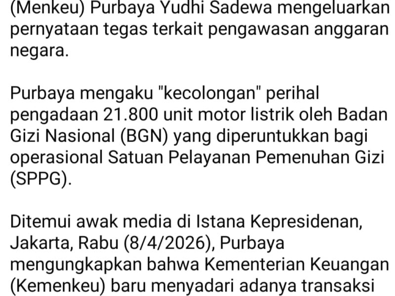 Purbaya mengaku “kecolongan” perihal pengadaan puluhan ribu unit motor listrik oleh Badan Gizi Nasional (BGN) yang diperuntukkan bagi operasional Satuan Pelayanan Pemenuhan Gizi (SPPG).