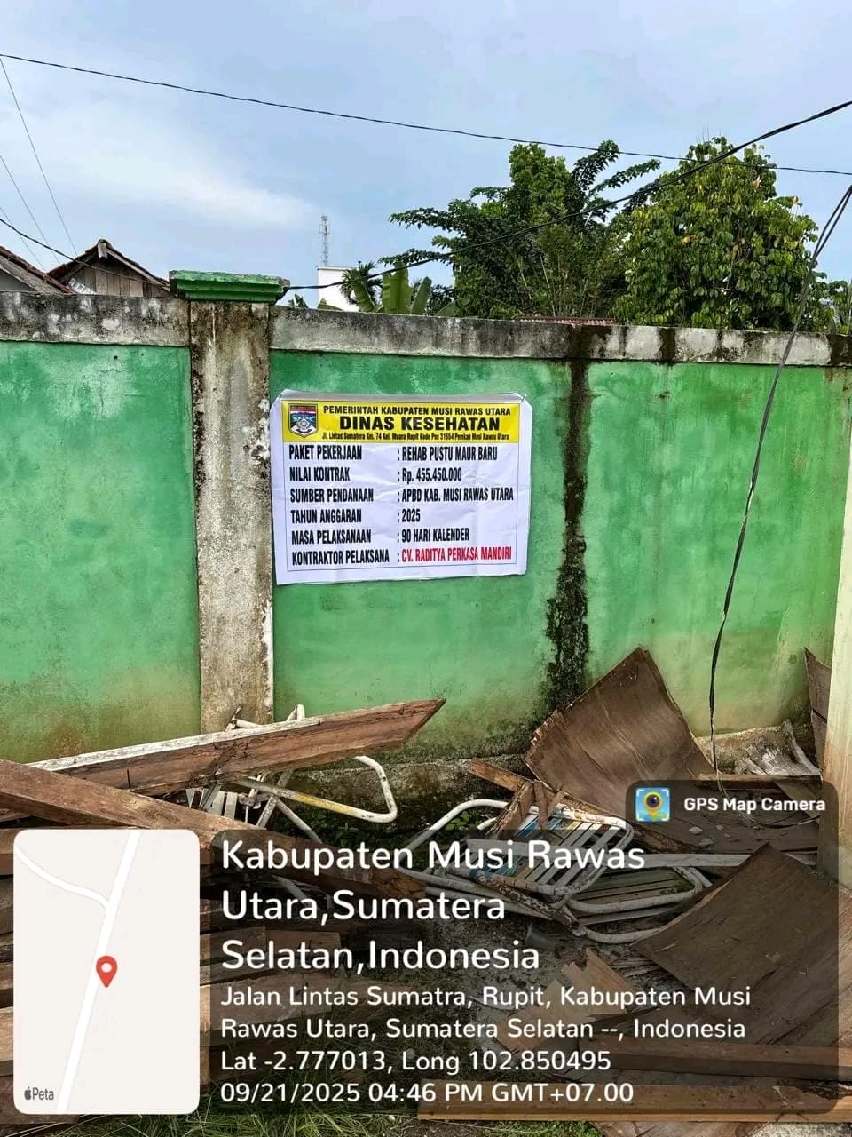 Dari pantauan awak media, papan informasi tersebut mencantumkan bahwa pekerjaan rehabilitasi Pustu Maur Baru dilaksanakan oleh Dinas Kesehatan Kabupaten Musi Rawas Utara dengan nilai kontrak sebesar Rp 455.450.000. Sumber dana berasal dari APBD Kabupaten Musi Rawas Utara tahun anggaran 2025, dengan masa pelaksanaan selama 90 hari kalender. Sedangkan kontraktor pelaksana tercatat adalah CV Raditya Perkasa Mandiri.